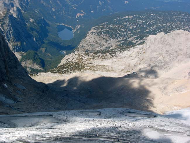 The Gosau lake, the Gosau glacier and the Adamek hut from the top of Hoher Dachstein.
